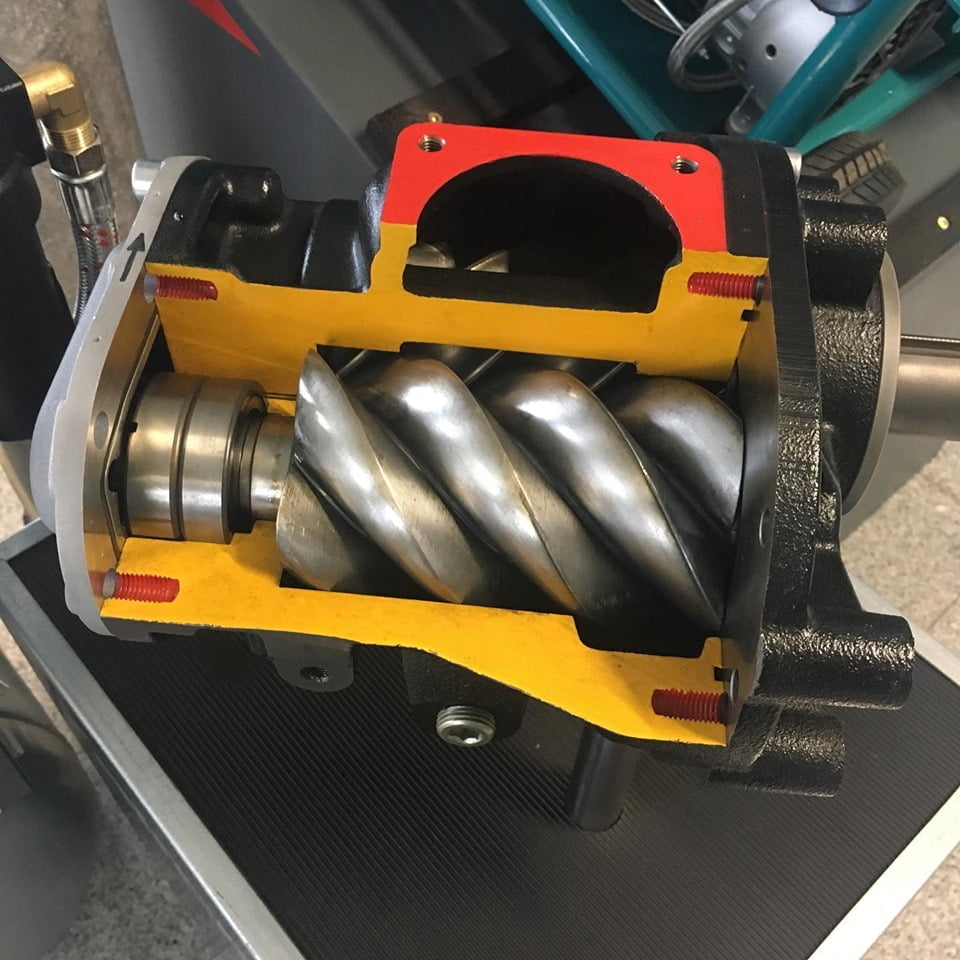 Ein Blick in das Innenleben des Verdichters, veranschaulicht die Schraubenförmigen Rotoren.