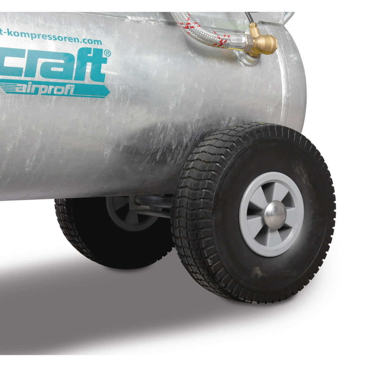 Druckregelung: Filterdruckregler Automatischer Druckschalter: CONDOR Antriebsübertragung: Direktgekoppelt Werkstoff Druckluftleitung: Flexible Panzerschlauchleitung mit Hitzeschutz Druckluftaufbereitung: Filterdruckregler, Nebelöler Anschlusskabel: 1,8 m Druckluftentnahme: Zwei Komfort-Sicherheitskupplungen, ein Kugelhahn Druckluftbehälter: Innen und außen feuerverzinkt mit fünfzehn Jahre Garantie gegen Durchrostung ZÜS geprüft: Prüfung vor Inbetriebnahme auch durch eine befähigte Person möglich Behälterbasis: Zwei Räder mit PU-Schaumbereifung, zwei Lenkrollen mit Feststellbremse |