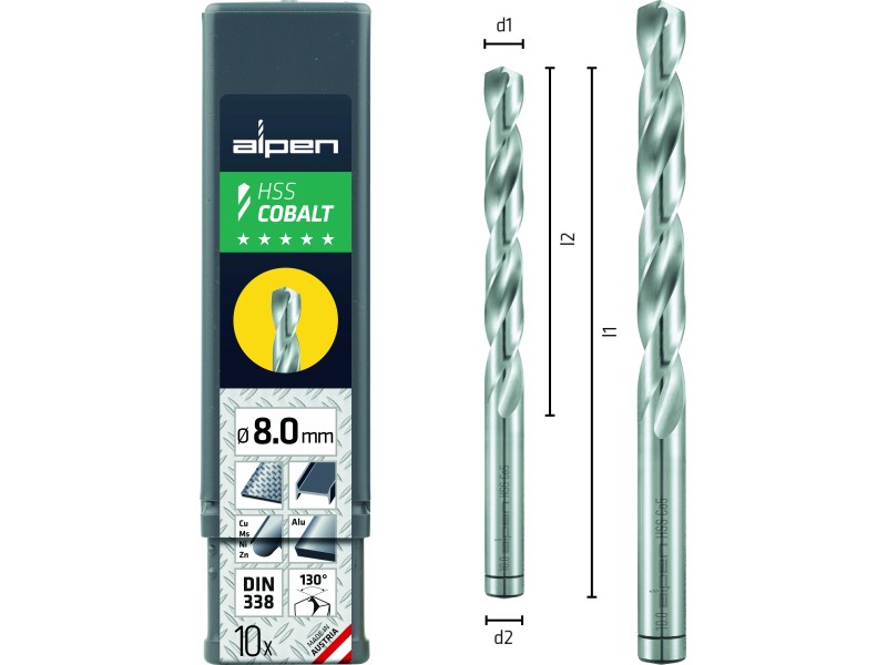 ✓ 5% kobaltlegierter Spiralbohrer mit sehr hoher thermischer Belastbarkeit zum Bohren von Werkstoffen mit höherem Legierungsgehalt und Festigkeit über 800 N/mm².