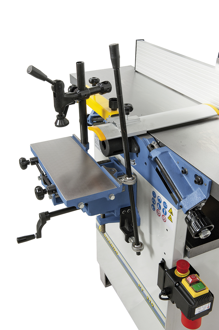 Die kompakte PT 310 Abricht- und Dickenhobelmaschine mit einer Abrichtbreite von 310 mm und einer Tischlänge von 1300 mm ist ideal für präzises Hobeln von Brettern und Balken. Mit einer Durchlassbreite von bis zu 180 mm und der Möglichkeit, optional Schlitz- und Bohrarbeiten durchzuführen, bietet diese Maschine eine hohe Vielseitigkeit. Sie verfügt über eine integrierte umklappbare Spanauswurfhaube und eine wartungsfreie 3-Messerwelle mit Hobelmesser in HSS-Qualität.