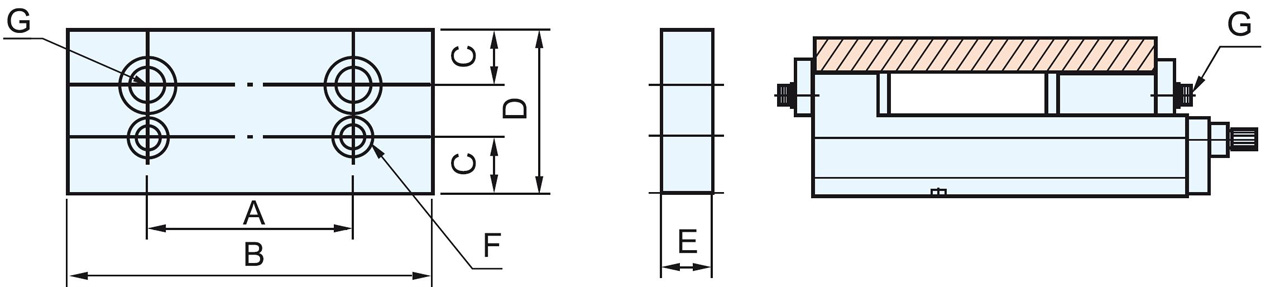 Das Produkt verfügt über verschiedene Dimensionen: A-60mm, B-100mm, C-22mm, D-63mm, E-21mm und Schraubengrößen F-M10 x 25, G-M12 x 20.