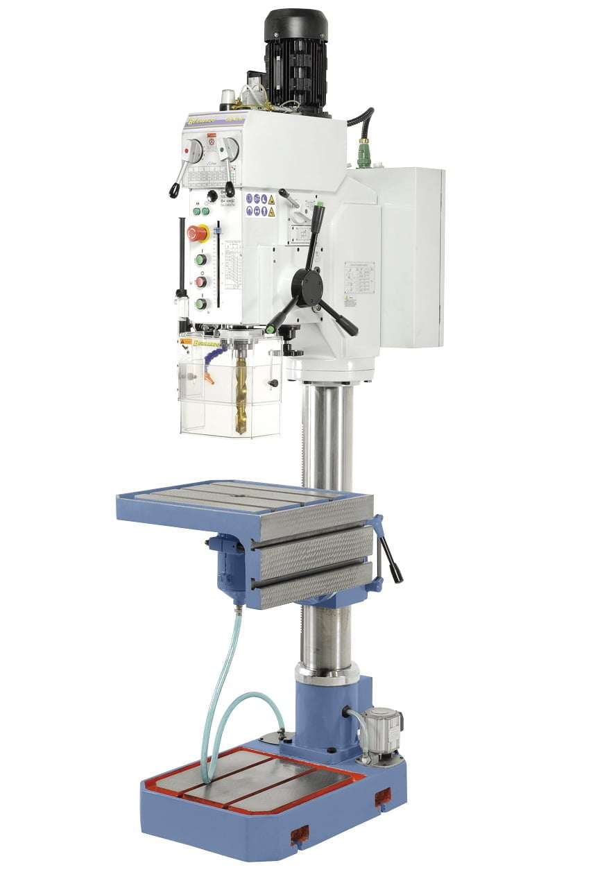 Die Getriebe-Säulenbohrmaschine ist durch ihre robuste Ausführung und großer Leistungsfähigkeit sowohl für Reparaturbetriebe als auch für die industrielle Fertigung verwendbar. Der serienmäßige Winkeltisch bietet zusätzlich vielseitige Aufspannmöglichkeiten, wodurch sich der Einsatzbereich der Maschine erweitert.