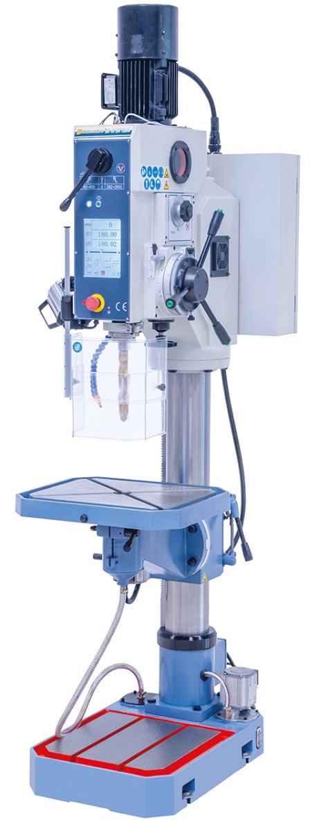 <p>Die Getriebebohrmaschine GB 40 NC Vario ist serienmäßig mit einem motorischen Tischhub ausgestattet. Die Digitalanzeige für die Bohrtiefe bzw. Drehzahl, der elektromechanische Spindelvorschub sowie die stufenlose Drehzahlregelung werten die Maschine weiter auf.</p>