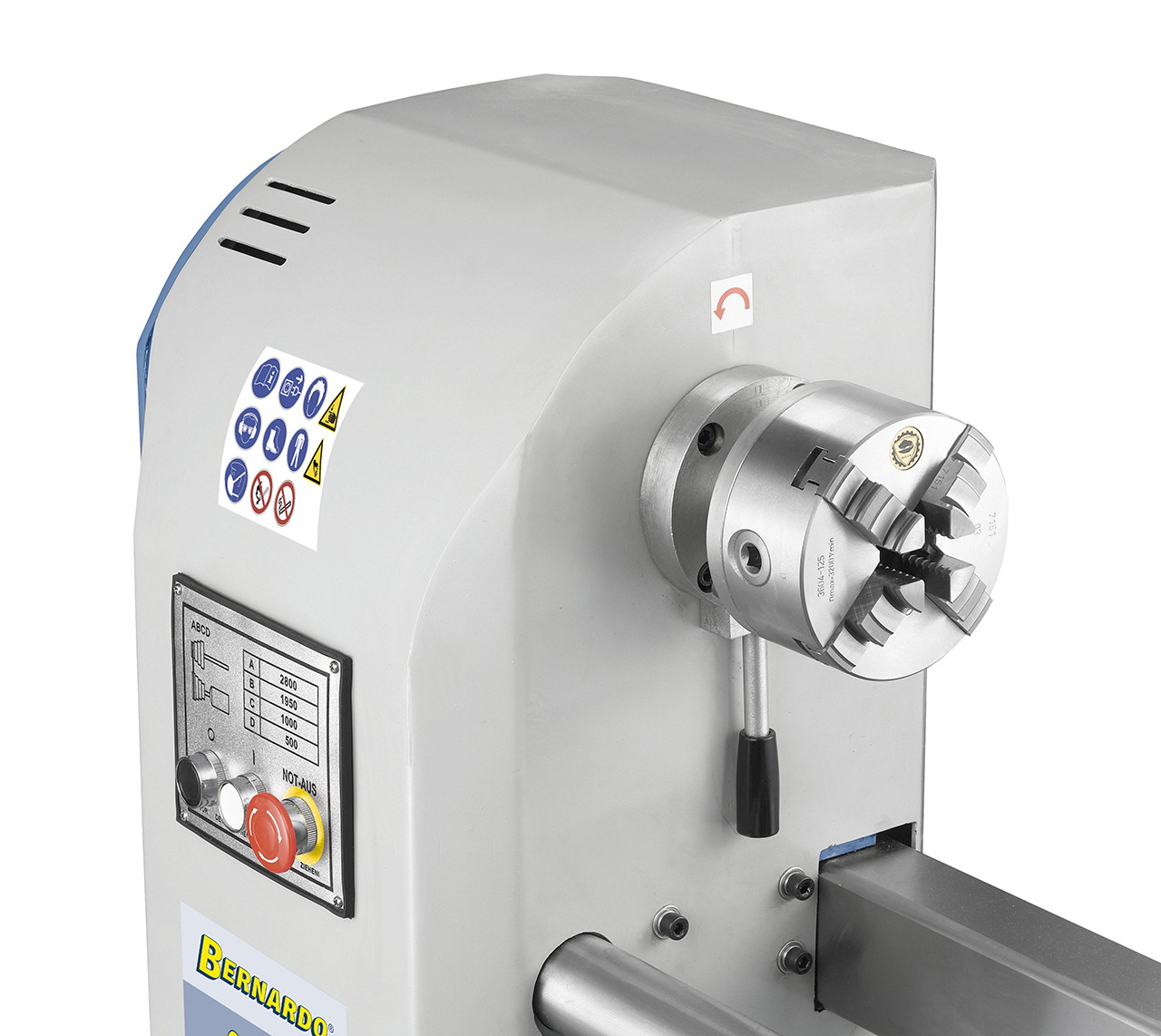 • In der umfangreichen Standardlieferung enthalten: Handauflage 290 mm, Aufspannscheibe 200 mm, mitlaufende Körnerspitze, Vierzackmitnehmer