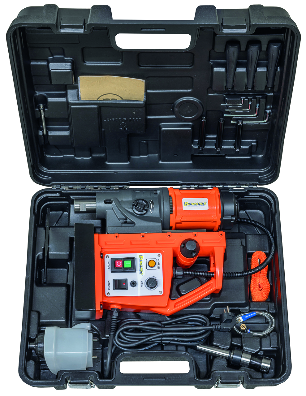 Dieses leistungsstarke Werkzeug mit maximal 100 mm Kernbohrer Durchmesser und 60 mm Bohrtiefe bietet einen starken Elektromagnet für höchste Magnethaltekraft und einen drehmomentstarken Antriebsmotor mit Sanftanlauf und Überlastschutz. Es verfügt über eine variable Drehzahleinstellung und automatische Innenschmierung. Mitgeliefert werden eine Kunststoffbox, Kühlbehälter und weitere wichtige Zubehörteile.