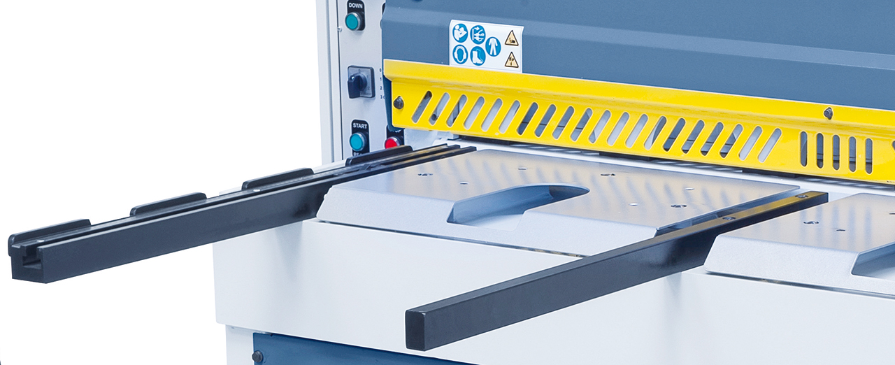 • Scherentisch mit rechtwinkeligem Anschlag für exaktes Einstellen des Werkstückes