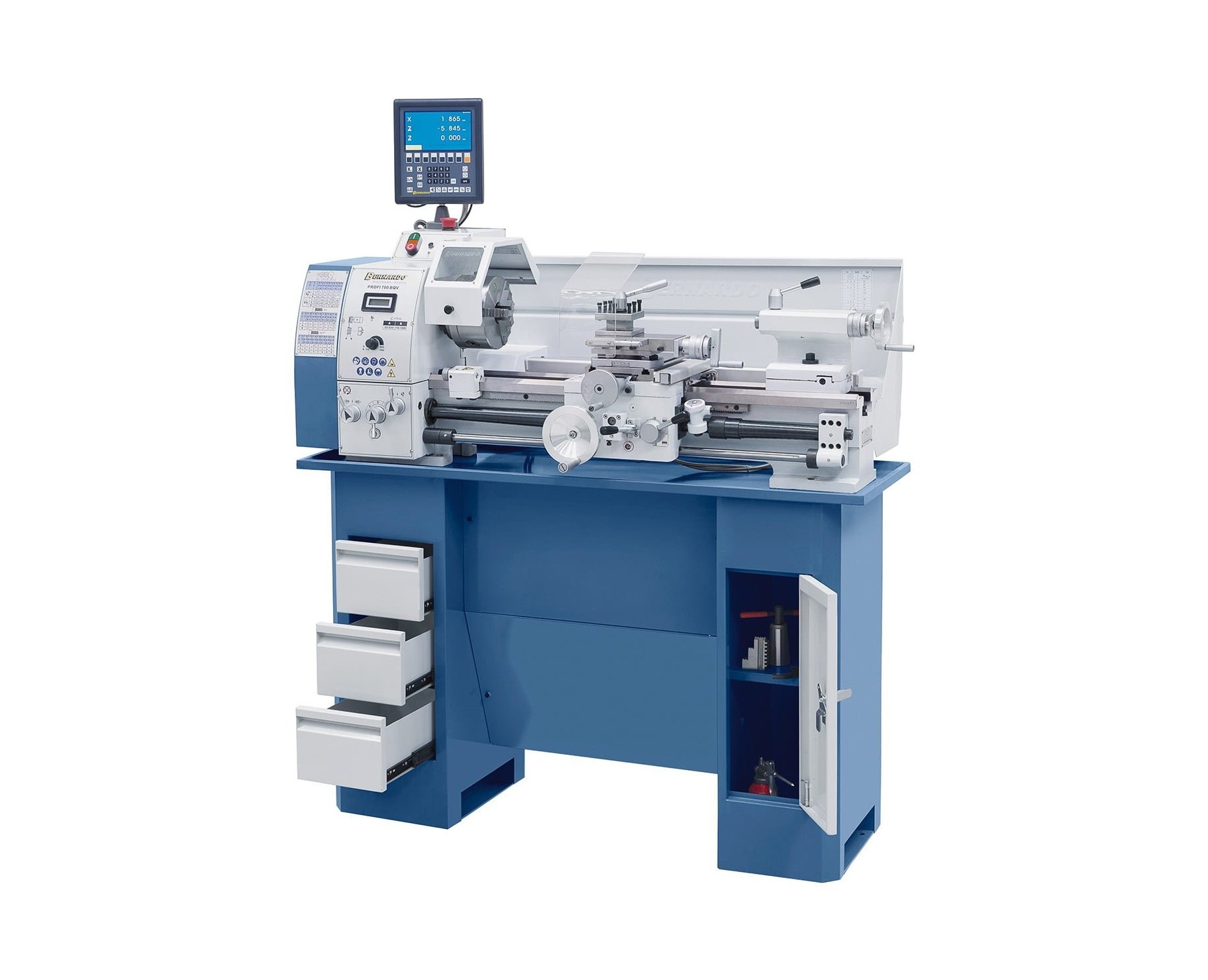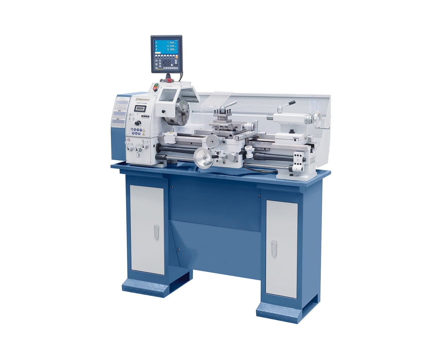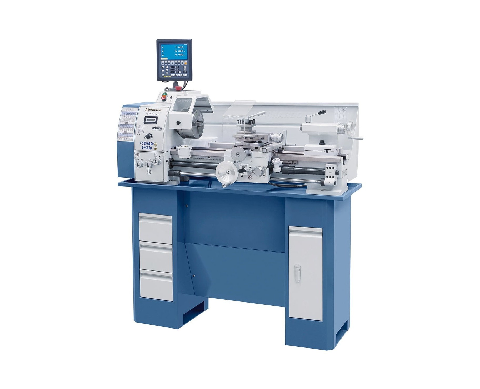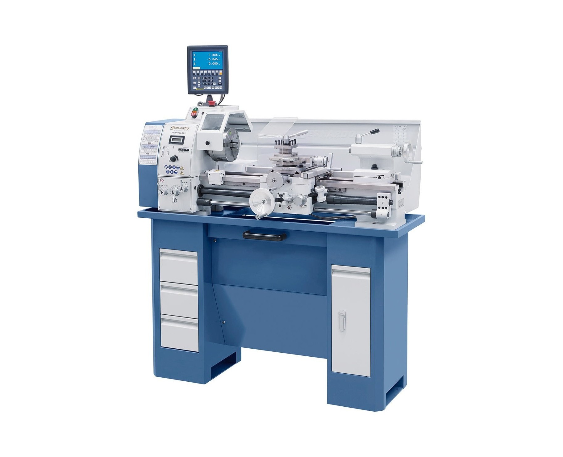 Die Vario-Drehmaschine Profi 700 BQV wird nach Werkzeugmachergenauigkeit gefertigt. Das Ablesen der elektronisch einstellbaren Drehzahl erfolgt komfortabel über eine Digitalanzeige am Getriebekopf. Die Besonderheit dieses Modells ist außerdem der große Längsvorschubbereich mit 14 frei wählbaren Vorschüben sowie der serienmäßige Planvorschub. Zur Reduzierung der Fertigungszeiten ist dieses Modell mit einer 2-Achs-Digitalanzeige ausgestattet.