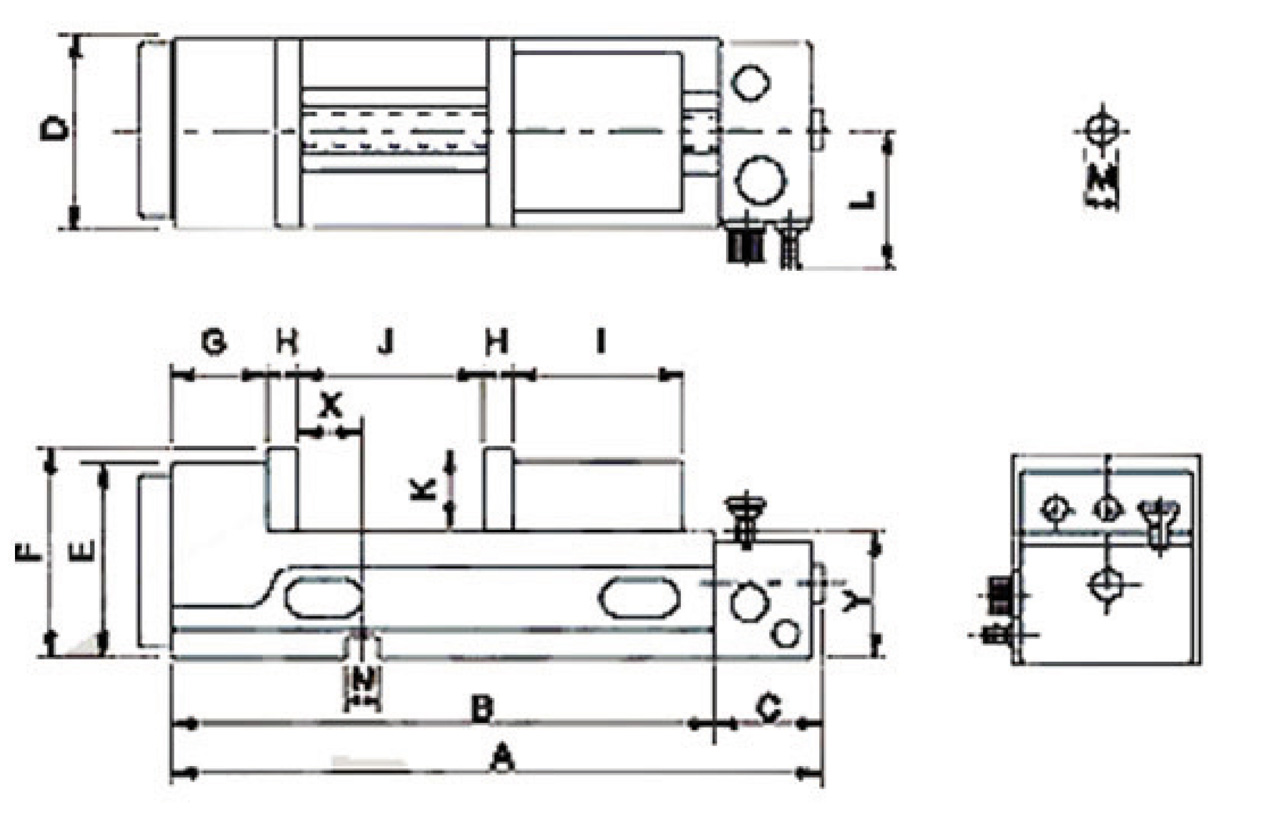 Dieses Produkt hat spezifische Abmessungen, einschließlich A: 507mm, B: 405mm, C: 102mm, D: 131mm, E: 152mm, F: 155mm, G: 100mm, H: 15mm, I: 115mm, J: 0 – 140mm, K: 55mm, L: 95mm, M: 14mm, N: 18mm, X: 65mm, Y: 100mm. Es funktioniert mit einem Luftdruck von 1,5 – 7,0 kg/cm² und einem Hub von 0 – 3 m/m. Das Gewicht beträgt ungefähr 40 kg.