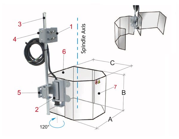 Diese universelle und stabile Vorrichtung bietet einen komplett geschlossenen Schutz und verfügt über einen seitlich öffnenden Schutzschirm mit eingebautem Mikroschalter. Sie schützt den Bediener vor direktem Kontakt mit rotierenden Spindelteilen und vor wegfliegenden Spänen sowie Kühlmittelspritzern. Die Vorrichtung kann an der linken Seite der Maschine befestigt und entsprechend der Spindelposition eingestellt werden. Sie wiegt 2,7 kg und hat die Maße 220x130x235.
