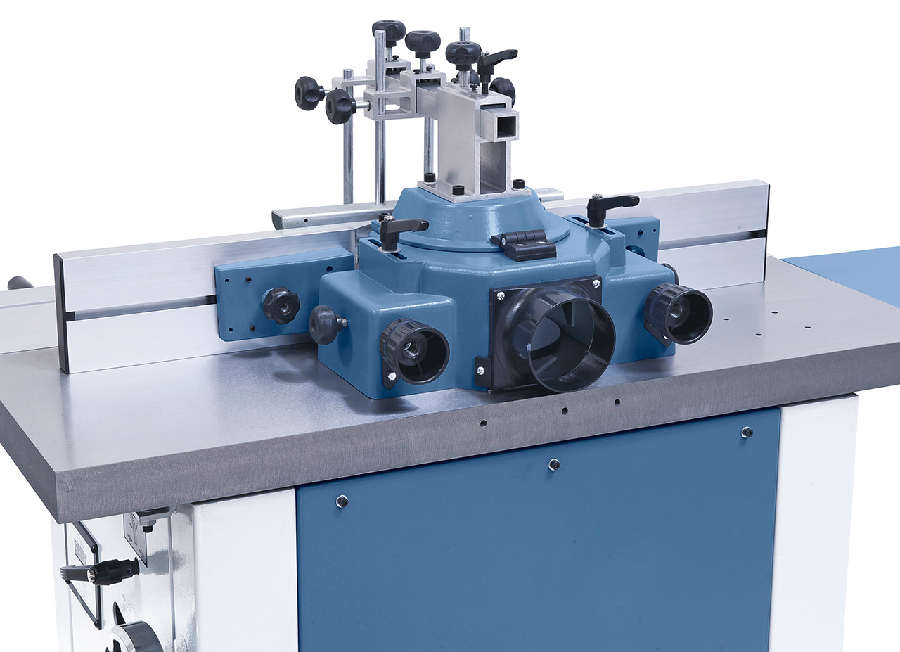 • Die nach hinten schwenkbare Frässpindel hat folgende Vorteile: Optimaler Einsatz eines Vorschubapparates, ein Maximum an Sicherheit und ein sauberes Fräsbild
