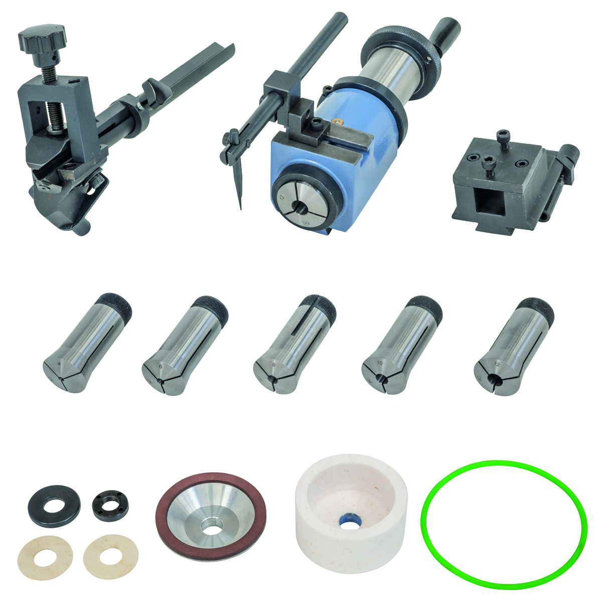 • Umfangreiches Standardzubehör: Aufnahme für Spiralbohrer, Schaftfräser und Drehmeißel, Diamantscheibe, Spannzangen, …