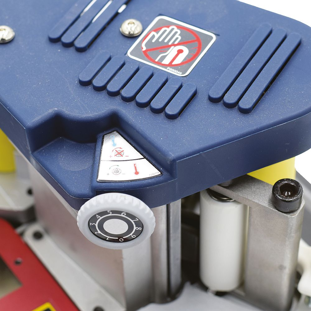 Das Klebeband wird präzise durch einen einstellbaren Breitenmesser (Auflösung 1 mm) geführt, der eine genaue und problemlose Führung des Klebebandes zum zylindrischen Klebebandaufleger ermöglicht. Zwei gummierte, ergonomische Griffe ermöglichen die präzise Führung der Maschine entlang des Werkstücks. Der Auflagetisch ist mit einer speziellen Gleitschicht versehen, die einen einfacheren Vorschub ohne Kratzer auf dem Werkstück ermöglicht. Er ist außerdem mit einer Skala zur präzisen Einstellung der Werkstückdicke ausgestattet und befindet sich in einer stabilen Halterung mit der Möglichkeit einer Neigung von +/-15°, die ein präzises Kantenanleimen von abgeschrägten Oberflächen ermöglicht. Der Deckelgriff kann je nach Art der Anleimung in zwei Positionen gebracht werden.