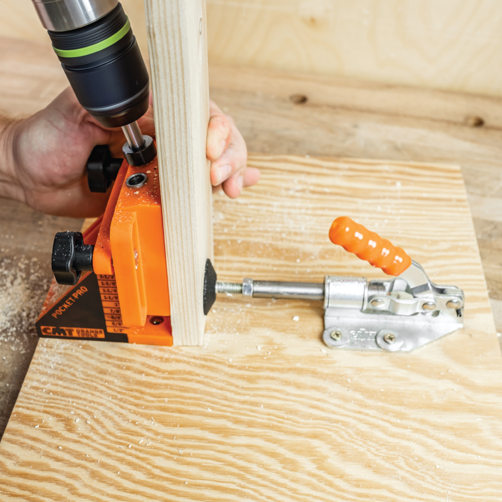 • Manche Produkte verlangen den Zusatz oder den Ersatz von einigen Teilen zur Bearbeitung verschiedener Stärken. Nicht mit der PocketPro™-Bohrhilfe, welche Verbindungen mit Stärken zwischen 12,7mm und 41,3mm ermöglicht, indem Sie einfach das System vertikal einstellen.
