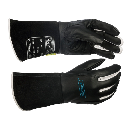 SOFTouch™, schwarzer Glatt, Rindsleder und weissem Ziegenleder allzweck, Hochcomfort Schweißerhandschuh mit eine Stulpe von spalt Rindsleder. Nahtloser Index-Finger zur besseren Führung des WIG-Stabes.