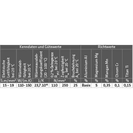 Aluminium-Schweißdraht AlMg5 für das MIG- und WIG-Schweißen von Aluminium-Magnesium-Legierungen. Verarbeitung unter Schutzgas Argon. Bei größeren Werkstücken und bei Wanddicken über 15 mm Schweißspalt auf 150 bis 200 °C vorwärmen.