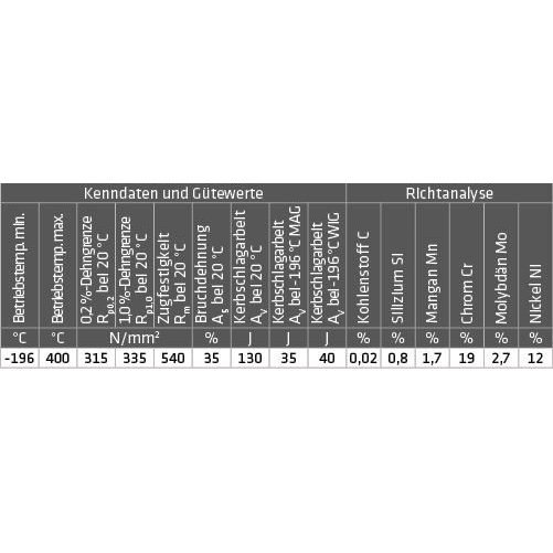 besonders niedrigem Kohlenstoffgehalt für das Verschweißen von nichtrostendem, kaltzähem, austenitischem Stahl. Gefüge Austenit mit Deltaferrit. Betriebstemperatur bis 400 °C. Kaltzäh bis -196 °C.