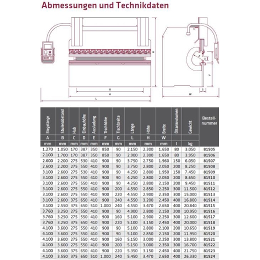 Technische Spezifikationen Elmag Hydraulische Abkantpresse 3-Achsen Mod. CNC-HAP 2100x40t