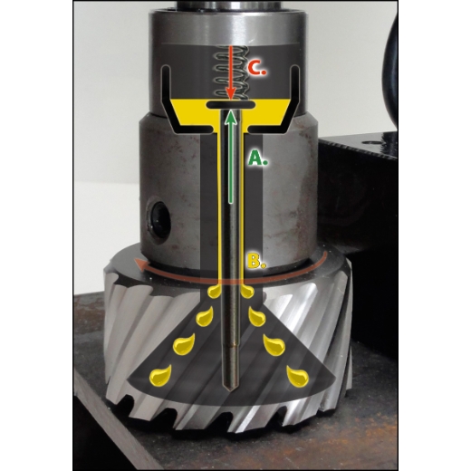 B. Durch die Rotation des Kernbohrers wird das Kühlmittel an die gewünschten Stellen gebracht.