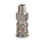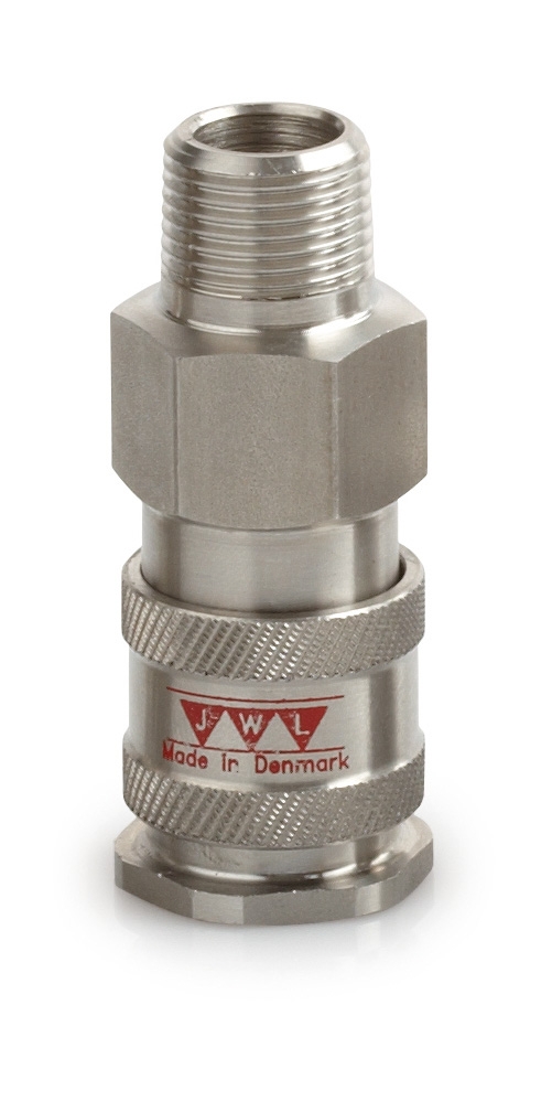 Edelstahlkupplung “AISI 316“ für den Lebensmittelbereich. Robust und schlagfest. Alle Kupplungen sind gepresst um Leckagen zu vermeiden. Niedriger Druckverlust durch optimiertes Ventilsystem. Einhändige An- & Abkupplung möglich.