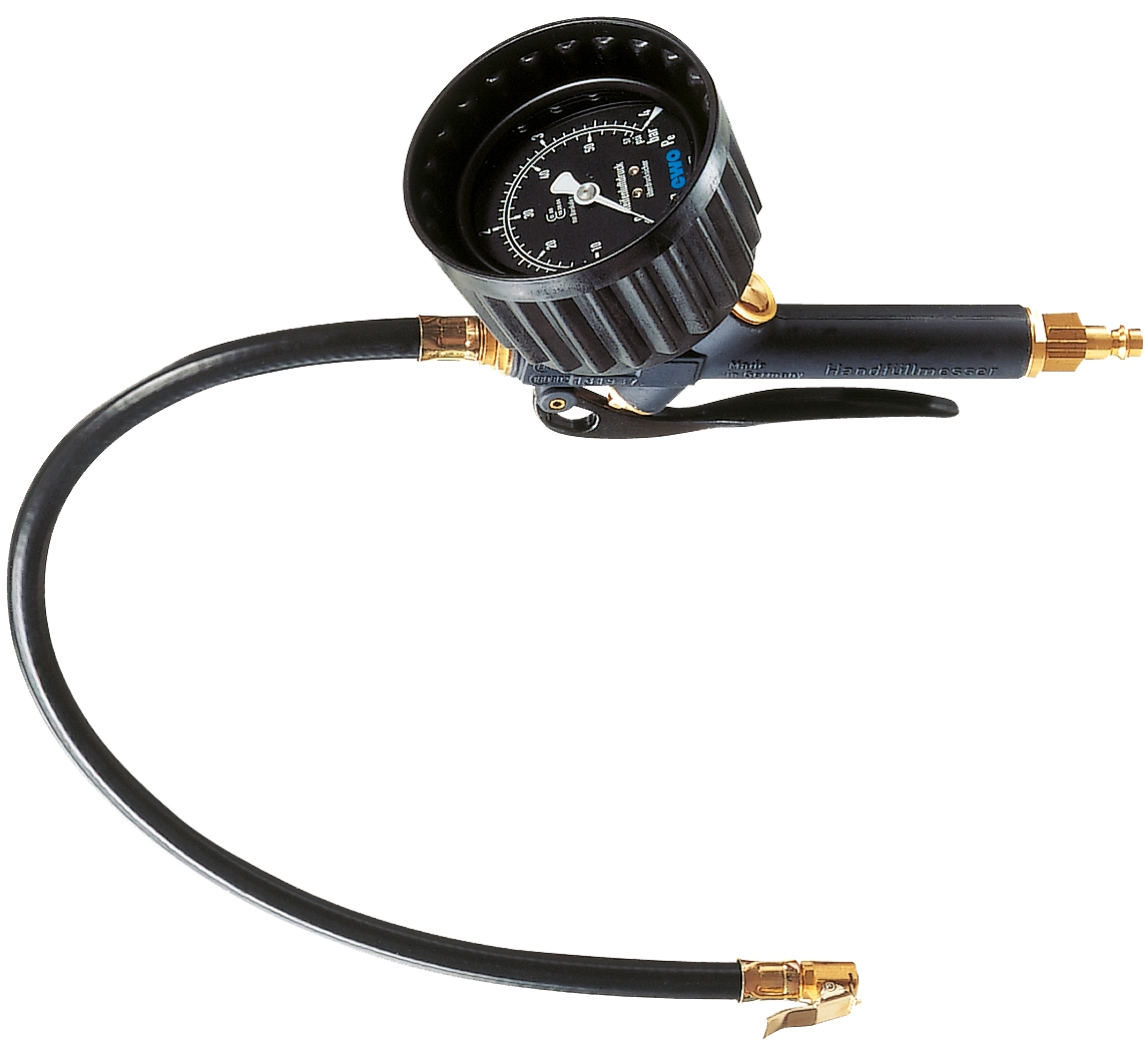 Der klassische Handfüllmesser mit Manometer ø 80 mm ist das typische Profigerät für Tankstelle und Werkstatt. Die Einhebelbedingung für Ablassen (halb gedrückt) und Füllen (ganz gedrückt) sorgt für einfache Handhabung