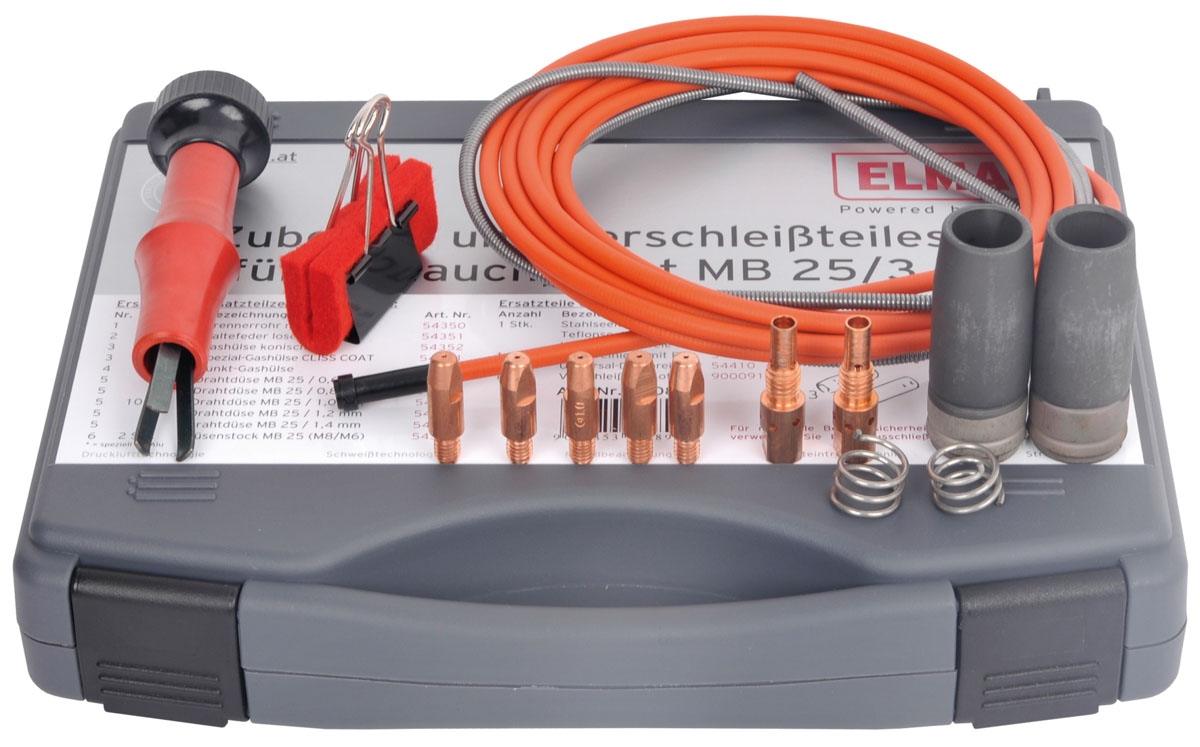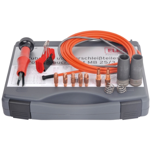 für Schlauchpaket MB 25 & MB EVO 25/3m/0,8/1,0mm zu Serie EUROMIG 270 u. 300, EUROMIG plus 271/272/274 u. 301, sowie MASTER MIG 250 bestehend aus: 2 Stk. Gashülse MB EVO 25 Art. Nr. 543521 Stk. Universal-Düsenreiniger Art. Nr. 54410 1 Stk. Drahtreiniger mit Filz Art. Nr. 54414 5 Stk. Drahtdüsen MB 25 / 0,8mm Art. Nr. 543555 Stk. Drahtdüsen MB 25 / 1,0mm Art. Nr. 54356 2 Stk. Düsenstock MB 25 Art. Nr. 543542 Stk. Haltefeder MB 25Art. Nr. 543511 Stk. Stahlseele 3mArt. Nr. 543901 Stk.Verschleißteil-KofferArt. Nr. 9000917
