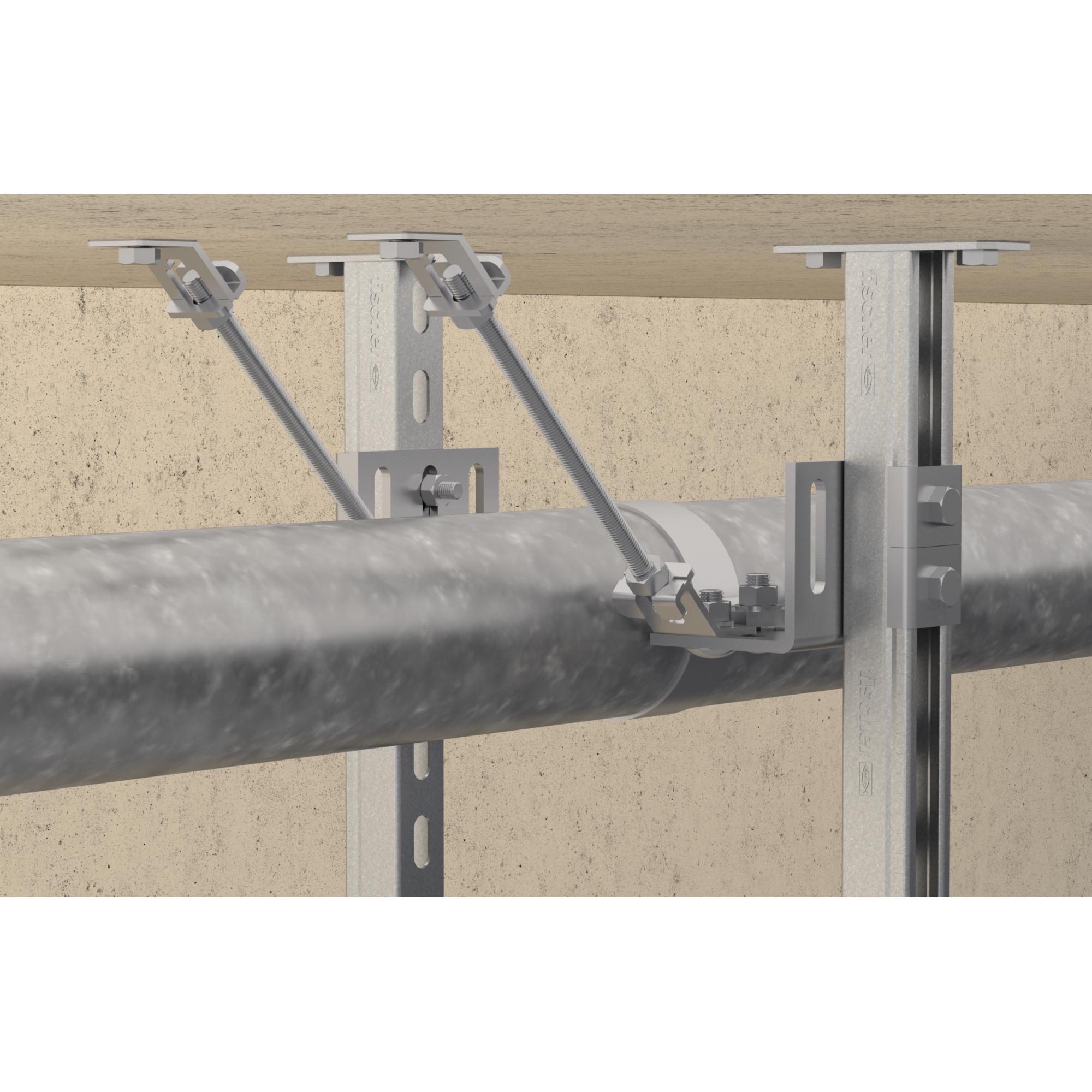 Das fischer Abspannelement FSB 45° ist ein 45°-Element für die Abspannungen der fischer Montageschienen FUS mit Gewindestangen an den Untergrund. Das Abspannelement wird mit einer Schraube M 10 und der Schiebemutter FCN-Clix P 10 an der fischer Montageschiene FUS montiert. Über die Aufnahme des Abspannelements kann die Gewindestange schnell eingesetzt werden. Die Lochung der Grundplatte ermöglicht die Befestigung direkt an Wand oder Decke bzw. auf einer Montageschiene. Die Ausführung mit galvanischer Verzinkung ist für Installationen in Gebäuden geeignet, die Versionen mit feuerverzinkter bzw. Zinklamellen (zl) Oberfläche und aus nicht rostendem Stahl sind für die Installation im Freien und hochkorrosiver Umgebung geeignet.