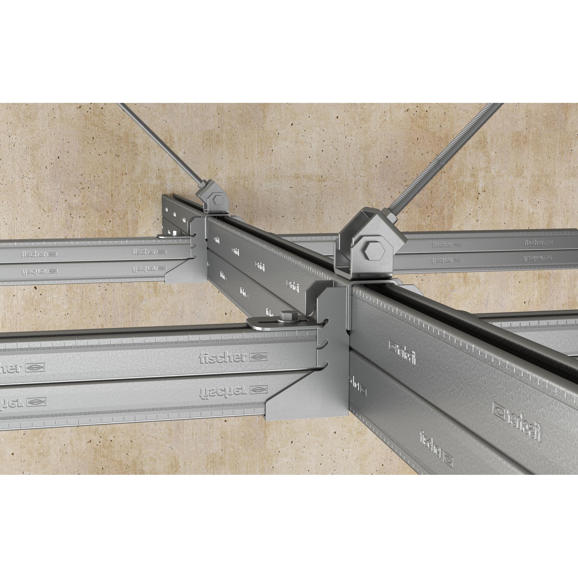 Das Universalgelenk FUH bietet vielfältige Anwendungsmöglichkeiten von der einfachen Abspannung mittels Gewindestangen zum Aussteifen von Schienensystemen oder zum Abhängen von Rohrleitungen an unebenen oder geneigten Untergründen.