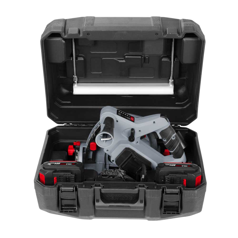 Das HOLZMANN TAS140AKKU Tauschsägen-Set mit 2 Akkus/Ladegerät/Führungsschiene, Parallelanschlag und BMC-Box (Platz für beide Akkus/Parallelanschlag/Ladegerät und Maschine). Aufladen und loslegen!