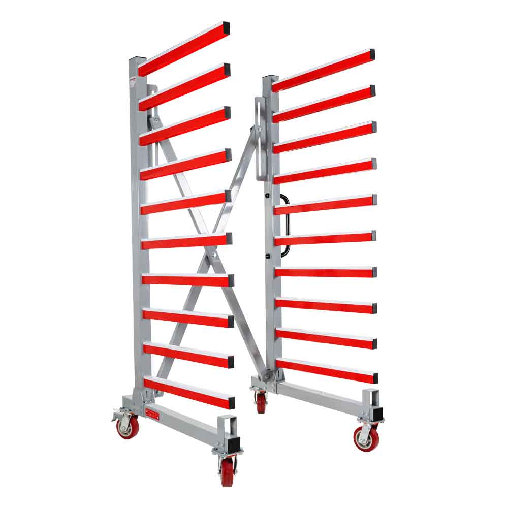 Der HOLZMANN TAW76 ist ein mobiler Tragarmwagen; bestens geeignet zum Transport und als Ablage oder zum Trocknen nach Lackierung von Platten/Latten,… Das Produkt ist in seiner Breite von 300 – 1250 mm veränderbar.