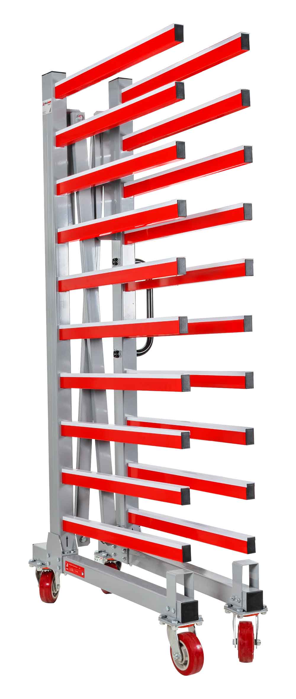 Der mobile Tragarmwagen HOLZMANN TAW76, ideal für den Transport und die Ablage oder das Trocknen von lackierten Platten/Latten, bietet eine verstellbare Breite von 300 – 1250 mm und wiegt 72 kg ohne Verpackung und 76 kg mit Verpackung.