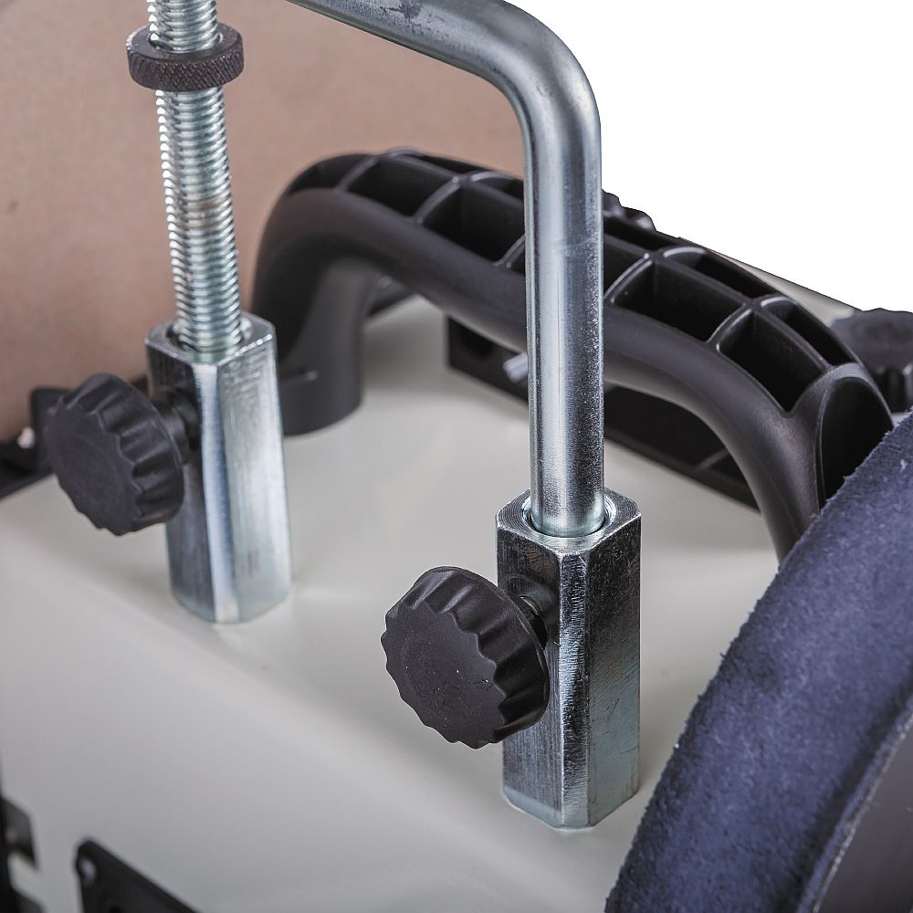 Der untere Teil vom Schleifstein ist in einem Wasserbad versenkt. Dreht sich der Schleifstein, wird das Wasser auf die geschliffene Oberfläche geleitet, die dadurch gekühlt wird, das Risiko der Materialüberheizung wird minimiert. Die Drehungen der Schleifmaschine sind 90 – 150 Drehungen pro Minute mit einem 160 W Motor. Die Motordrehungen können reguliert werden. Wenn die Schleifscheibe einen Durchmesser von 250 mm hat, stellen Sie niedrigere Drehungen ein – 90 Drehungen / min. Wird der Schleifstein im Laufe der Zeit weggeschliffen und der Durchmesser kleiner, verwenden Sie dann den Drehungsregler und erhöhen Sie dann die Drehungen, um eine optimale Umfangsgeschwindigkeit zu erreichen.