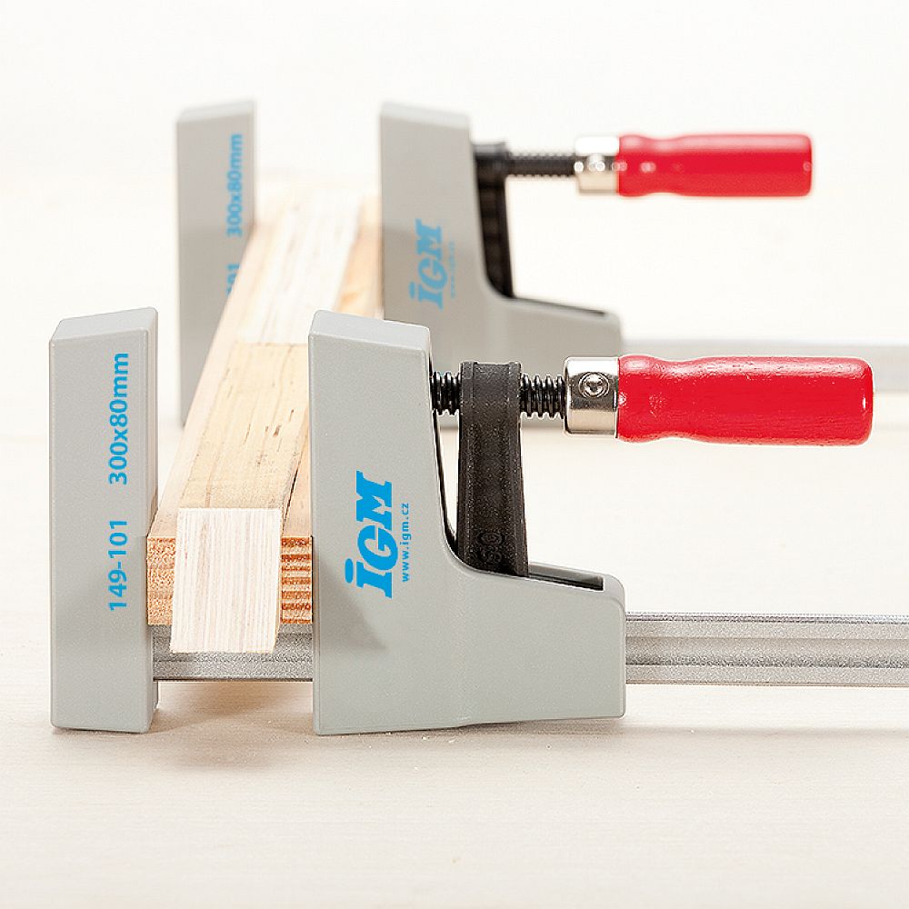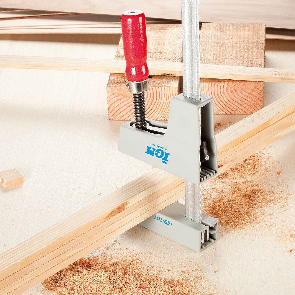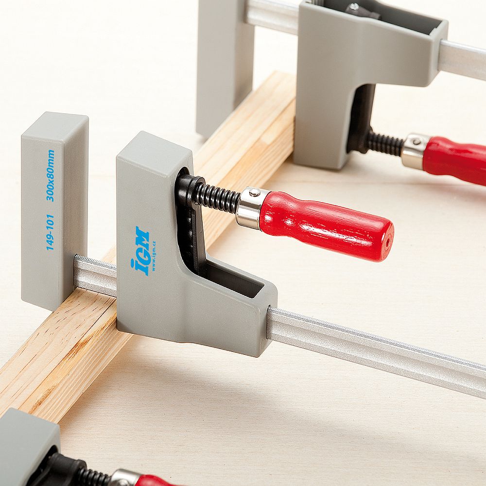 IGM Korpuszwingen sind extrem vielseitig. Ihr geringes Gewicht macht sie praktisch für kleinere oder mittelgroße Projekte in der Werkstatt oder unterwegs. Die Zwinge bietet ausreichend Kraft, um das Material beim Aushärten des Klebstoffs festzuhalten. Die große Fläche der Backen kann den Druck gleichmäßig verteilen. Schutzkappen aus Polyamid schützen die Backen vor auslaufendem Klebstoff. Die Backen haben den Vorteil, dass sie nach dem Einspannen des Werkstücks über die gesamte Spannfläche parallel bleiben. Der Spannkopf ist umsteckbar, wodurch die Zwinge zum Spreizen verwendet werden kann. Es ist eine ausgezeichnete und komfortable Zwinge für leichte bis mittelschwere Anwendungen. Ihr maximaler Spanndruck beträgt 180 kg.