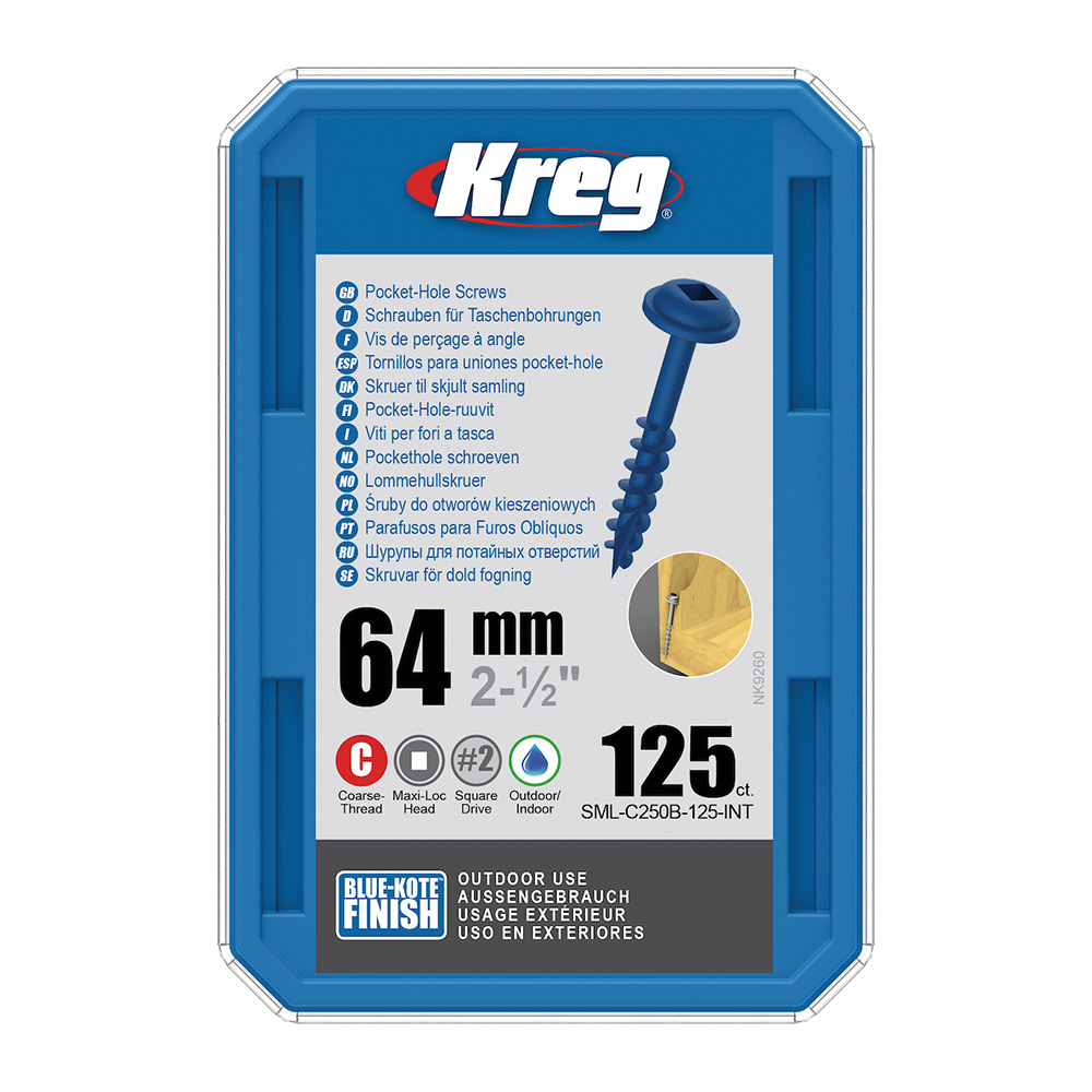 Startseite » Shop » Kreg Blue-Kote Maxi-Loc Pocket-Hole Schrauben – 64 mm, grobgewinde, 125 Stück