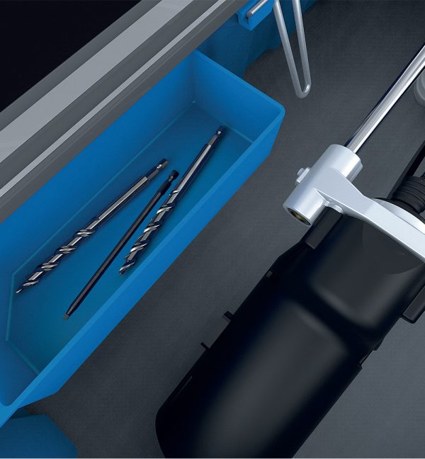 Sie werden den integrierten Stauraum lieben. Sie haben immer zusätzliche Bohrer, Bits oder anderes Zubehör zur Hand. Ein Saugadapter ist ebenfalls im Lieferumfang enthalten. So bleibt der Arbeitsplatz perfekt sauber.