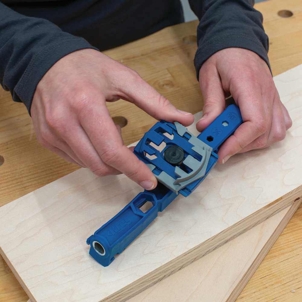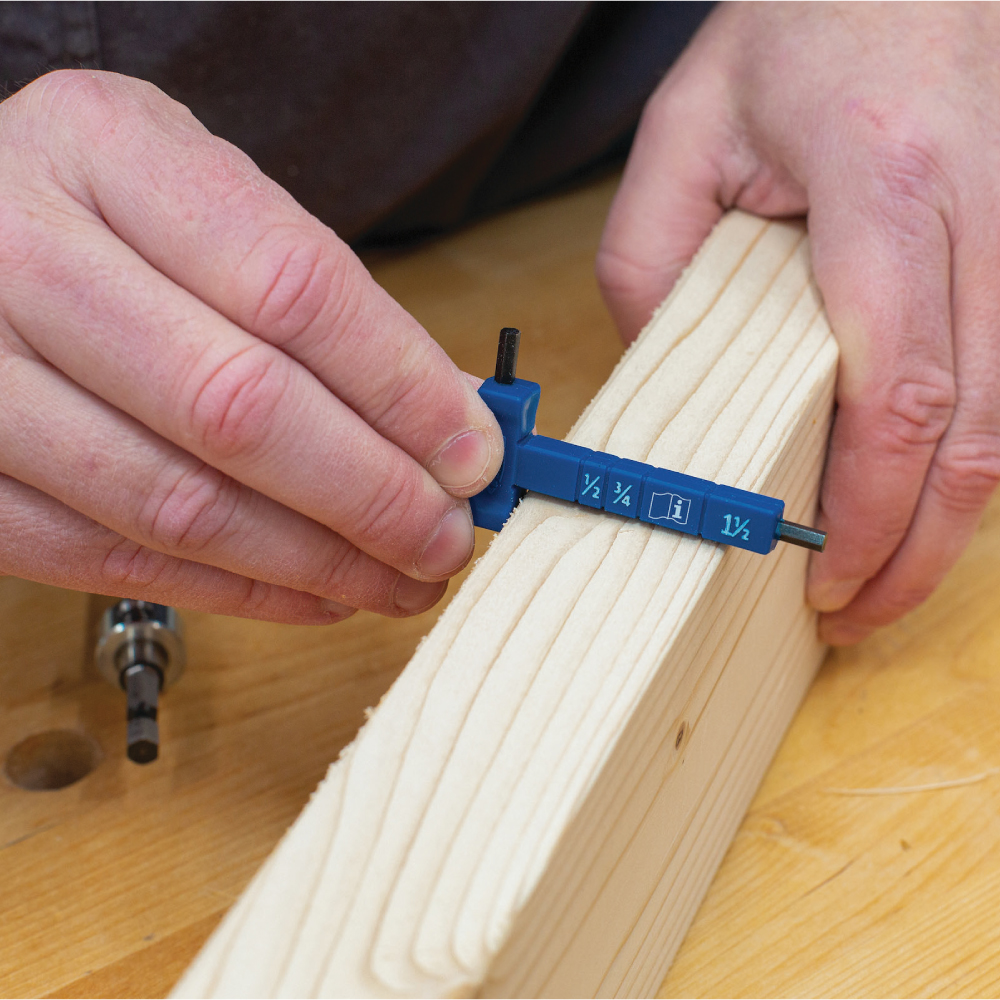 Eine Materialstärkenanzeige und ein Bohrer mit leicht einstellbarem Anschlag erleichtern die Arbeit, während eine rutschfeste Unterlage das Werkzeug sicher an Ort und Stelle hält. Dadurch bohren Sie jedes Mal perfekt positionierte verdeckte Fugen. Robuste Konstruktion und Gehäuse sorgen für eine lange Lebensdauer.