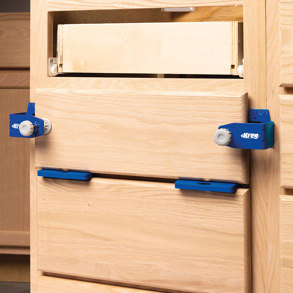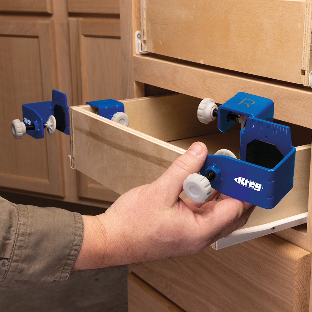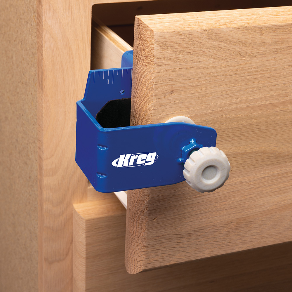 Mit dieser Kreg-Vorrichtung können Sie Schubladenfronten einfach und schnell montieren, reparieren, präzise ausrichten und versetzen. Die solide Stahlkonstruktion, große Auflageflächen mit GripMaxx-Oberfläche und gerillte Ecken minimieren das Durchbiegen der Vorrichtung und halten die Schubladenfront fest an Ort und Stelle.