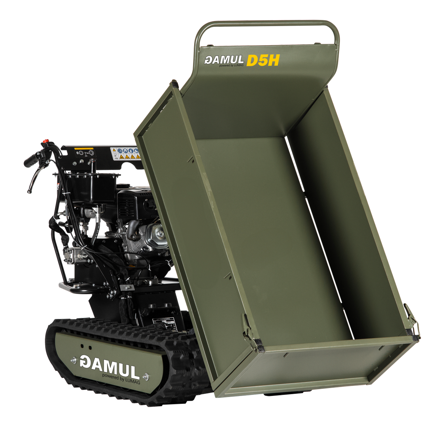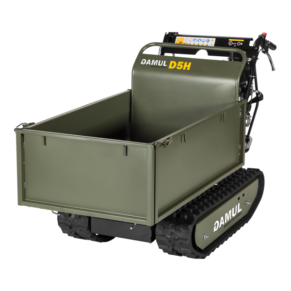 Der benzinbetriebene Mini-Raupendumper GAMUL-D5H ist der perfekte Helfer für alle Transportarbeiten in den unterschiedlichsten Branchen. Mit einer Tragkraft von bis zu 500 kg transportiert er problemlos Schütt- und Stückgut auch auf anspruchsvollem Gelände. Dank seiner extrem schmalen Bauweise und kompakten Abmessungen kommt der GAMUL-D5H auch durch schmale Tore und Wege sicher zum Einsatzort. Die hydraulische Kippmulde mit steckbaren Bordwänden ermöglicht eine bequeme Entleerung. Seine massive Stahlkonstruktion und der kraftvolle Hydraulikzylinder in Kombination mit der einfachen, intuitiven Steuerung machen den GAMUL-D5H zum idealen Helfer für eine Vielzahl von Transportarbeiten.<br><br>- Extrem schmale Bauweise und kompakte Abmessungen – Die Entleerung von Schütt- und Stückgut erfolgt durch eine hydraulische Kippmulde. – Die Kippmulde ist mit steckbaren Bordwänden ausgestattet – Die massive Stahlkonstruktion und der kraftvolle Hydraulikzylinder in Kombination mit der einfachen, intuitiven Steuerung machen den GAMUL-D5H zum idealen Helfer. – Optional erhältlich: Holzrungen und Schneeräumschild