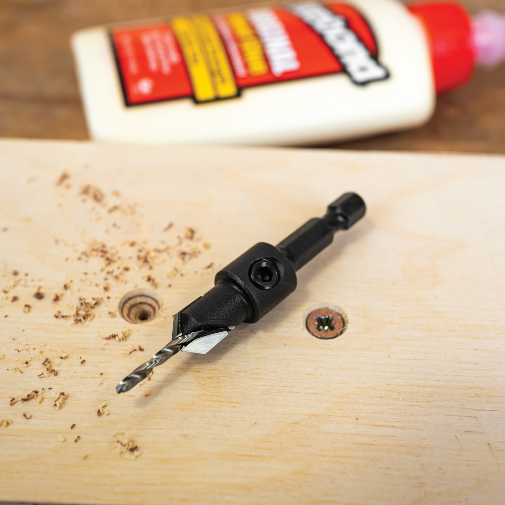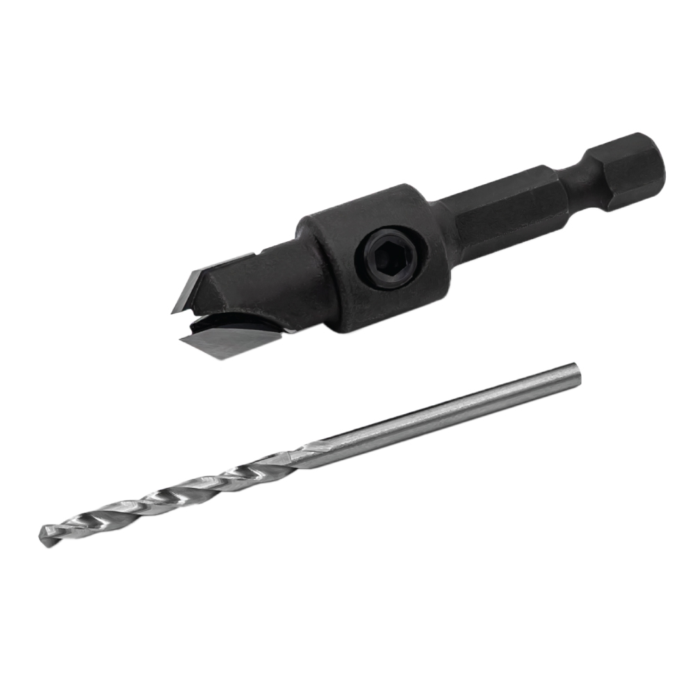 Dieses Werkzeug kann auf harten Materialien wie Schichtpressstoff, Spanplatte, MDF, Hartholz und exotischem Holz eingesetzt werden. Er bohrt und versenkt. Sechskant-Schnellspannschaft.