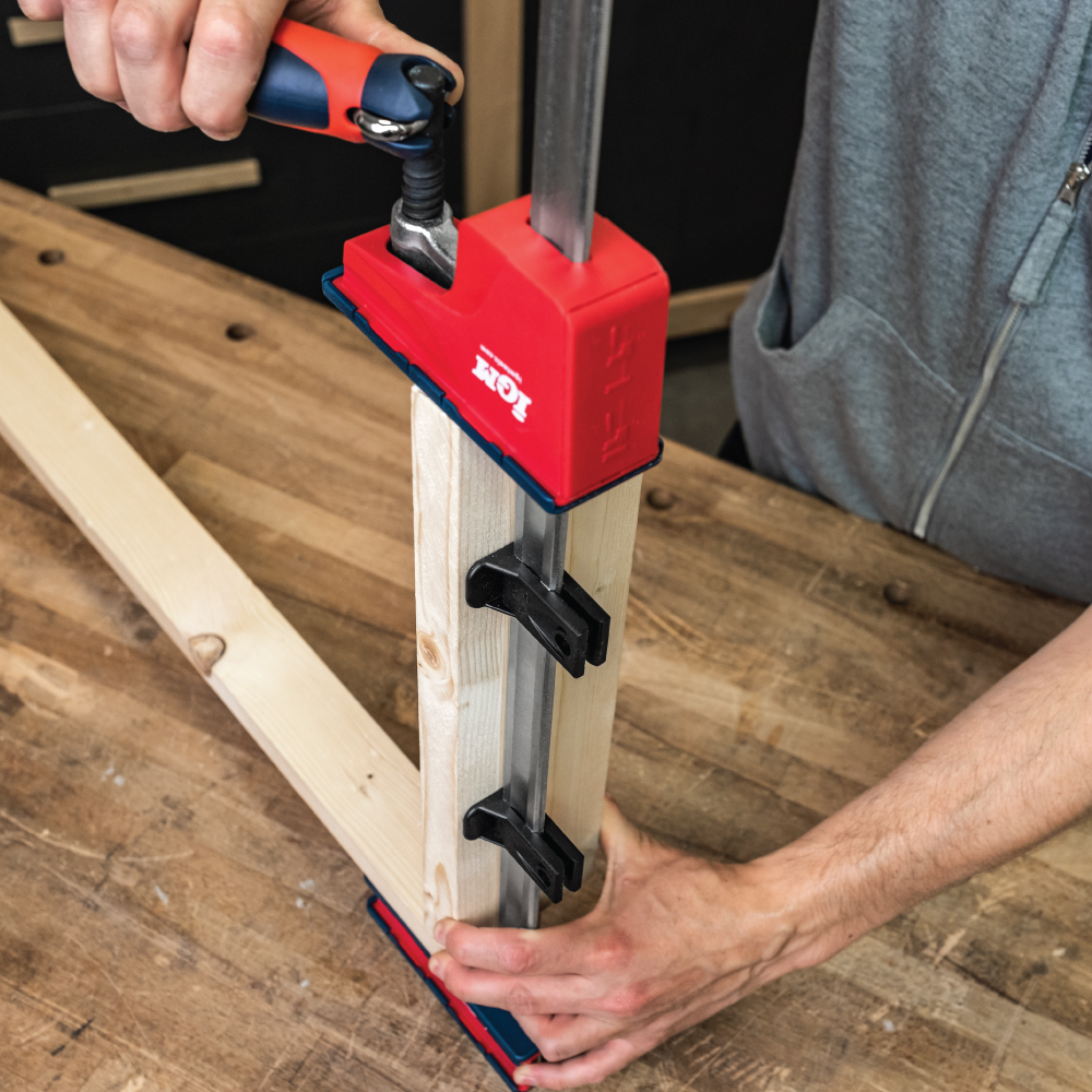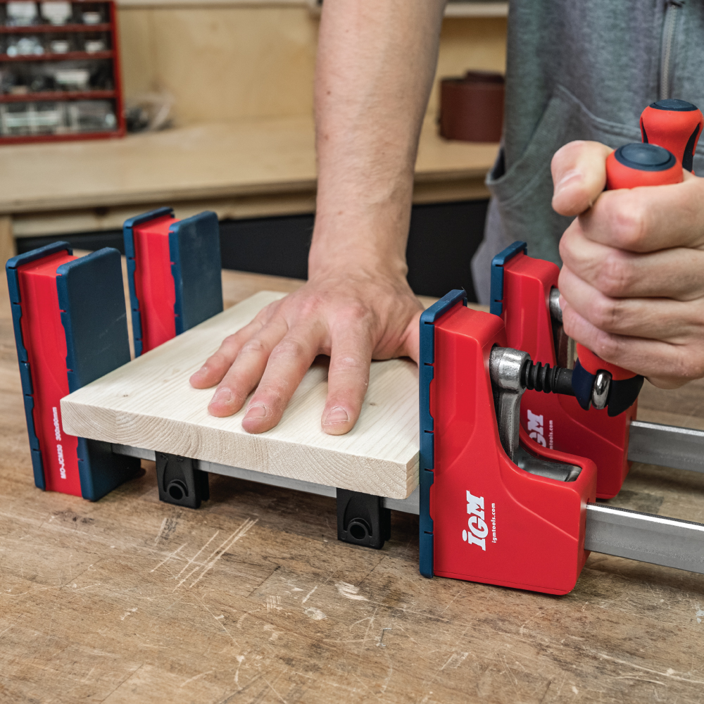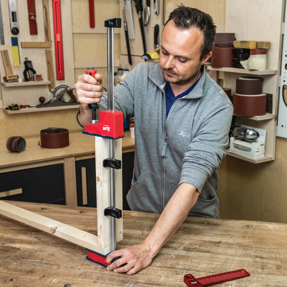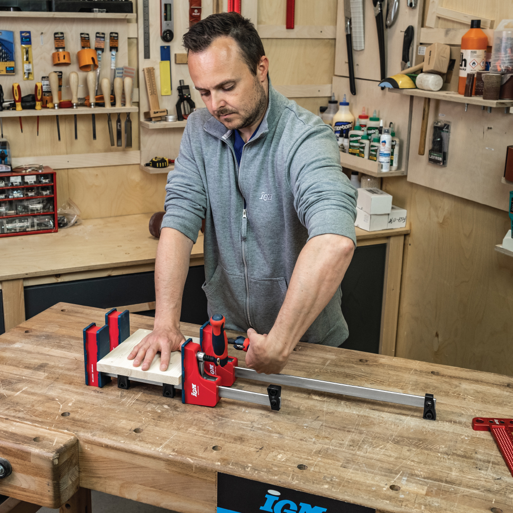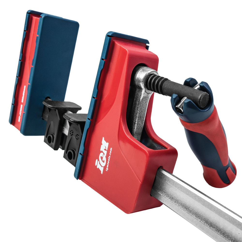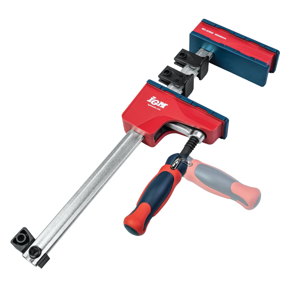 IGM MD Korpuszwingen für mittlere Belastung sind hauptsächlich zum Ziehen von verleimten Korpussen gedacht, können aber auch zum Ziehen und Expandieren jeglichen Materials verwendet werden. Dank ihrer geringeren Größe im Vergleich zu HD-Korpuszwingen werden Sie sie beim Ziehen kleinerer und mittelgroßer Teile zu schätzen wissen. Der gummierte Klappgriff, mit dem Sie problemlos eine hohe Klemmkraft von bis zu 460 kg erreichen können, ermöglicht ein straffes Ziehen des Körpers während des Aushärtens des Klebers. Die Führungsstange besteht aus kaltgezogenem, verzinktem Stahl und ist stark profiliert, um die Durchbiegung zu minimieren.