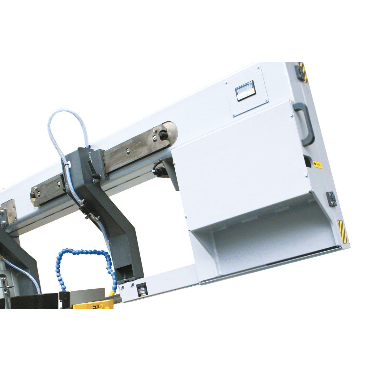 • Mit STOPP-Funktion – Sägevorgang kann jederzeit durch Betätigung eines Schalters unterbrochen werden. Das Band läuft weiter, währenddessen der Arm aus dem Schnittkanal fährt