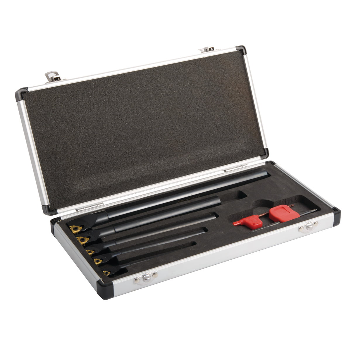 Das 5-teilige Set (8/10/12/16/20 mm) mit TIN-beschichteten HM-Wendeplatten wird in einer Aluminiumbox von Optimum Maschinen Germany GmbH, ansässig in Hallstadt, Deutschland, angeboten.