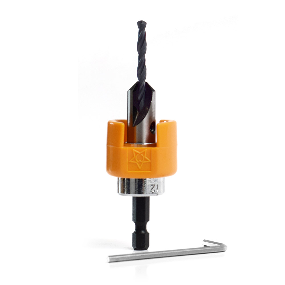 Der Senker besteht aus vier Teilen, einem Schnellspann-Schaft, einem verstellbaren Metall- und Holzbohrer zum zentrischen Vorbohren von Löchern, einem hochwertigen Senker und einem verstellbaren Stopp-Anschlag zur Tiefeneinstellung. Bei Erreichen der eingestellten Bohrtiefe legt sich der Kunststoffanschlag an das zu bohrende Material an und verhindert so ein Verkratzen des Materials.