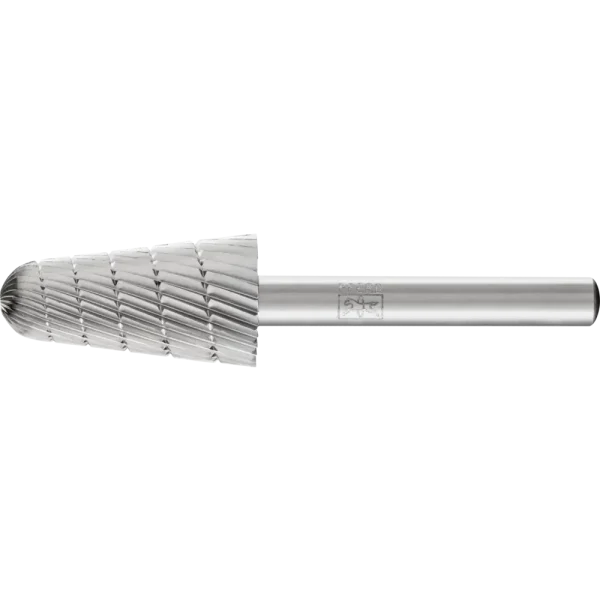 Zahnung 3 ist mit Spanbrechern versehen und eignet sich besonders gut zur Zerspanung von Stahl, Stahlguss und Gusseisen. Sie wird in einem Drehzahlbereich je nach Frässtiftdurchmesser von 1.200 bis 7.900 RPM eingesetzt. Rundkegelförmiger Frässtift.
