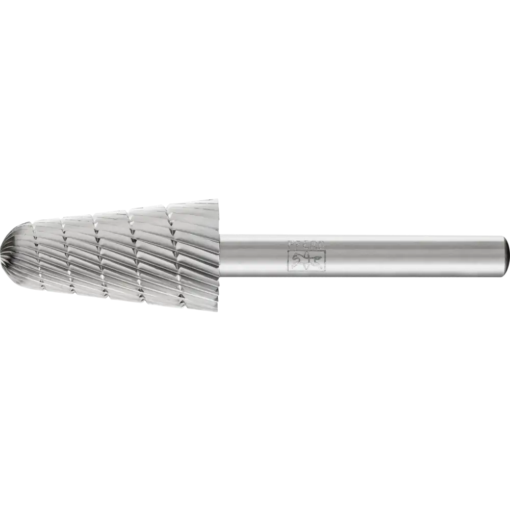 Startseite » Shop » Metallbearbeitung » Frässtifte & Entgratwerkzeuge für Metall, Edelstahl und Guss » HSS Frässtifte » Pferd Tools HSS Frässtift Rundkegelform L Ø 16x30mm Schaft-Ø 6 mm Z 3 universal mittel fein Spanbrecher