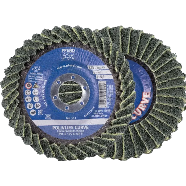 Für den universellen Einsatz von Grob- bis Feinschliff in Industrie und Handwerk. Die Ausführung Curve ist sowohl auf der Schleifseite als auch auf der Rückseite sowie am Radius zu verwenden. Die POLIVLIES-Fächerscheibe PVL-R wurde speziell für die Kehlnahtbearbeitung entwickelt. Sie ist die weltweit einzige Fächerscheibe, die sowohl auf der Schleifseite als auch auf der Rückseite sowie am Radius mit Lamellen belegt ist. Die POLIVLIES-Fächerscheibe PVL-R von PFERD TOOLS ist in vielen Ländern der Welt patentiert. POLIVLIES-Korngröße 240 F = fein (blau)