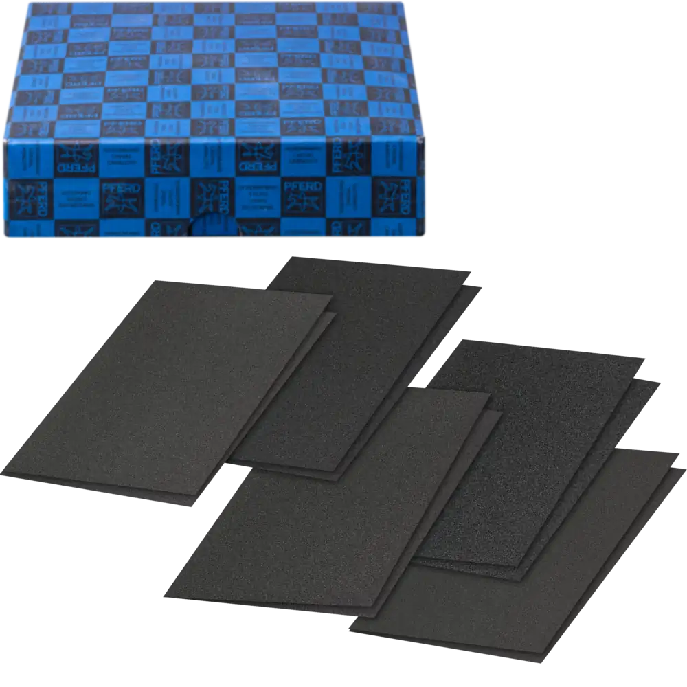 Für die Bearbeitung unterschiedlicher Werkstückgeometrien und Werkstoffe bietet PFERD TOOLS eine breite Palette von Werkzeugen aus Schleifmittel auf Unterlage an. Sie bestehen aus einem Trägermaterial, einer Grundbindung sowie einer Deckbindung zur Fixierung der Schleifkörner. Je nach Korngröße kann mit Werkzeugen aus Schleifmittel auf Unterlage ein hoher Materialabtrag oder ein sehr feines Oberflächenfinish erzielt werden. Die zur Auswahl stehenden Trägermaterialien unterscheiden sich in ihren Eigenschaften wie Reißfestigkeit, Flexibilität und Verschleiß. Mit der Wahl der geeigneten Unterlage wird das Schleifwerkzeug an die Erfordernisse der vorgesehenen Anwendung angepasst: Papier findet sich in der holzverarbeitenden Industrie und im Handwerk, z. B. bei Schreinern, Malern und Lackierern, wieder, Gewebe wird überwiegend in der Metallbearbeitung eingesetzt, und Vulkanfiber ist sehr verschleißfest und wird in unterschiedlichen Stärken vorwiegend für die Fertigung von Fiberschleifern verwendet. Das Set enthält zehn Schleifbögen der Ausführung Gewebe blau mit Schleifmittel Korund A in verschiedenen Korngrößen. Das Gewebe blau ist die kostengünstige Alternative für normale Beanspruchung bei der Bearbeitung von lackierten Flächen auf Holz und Metallen. Blattware Gewebe entspricht ISO 21948.