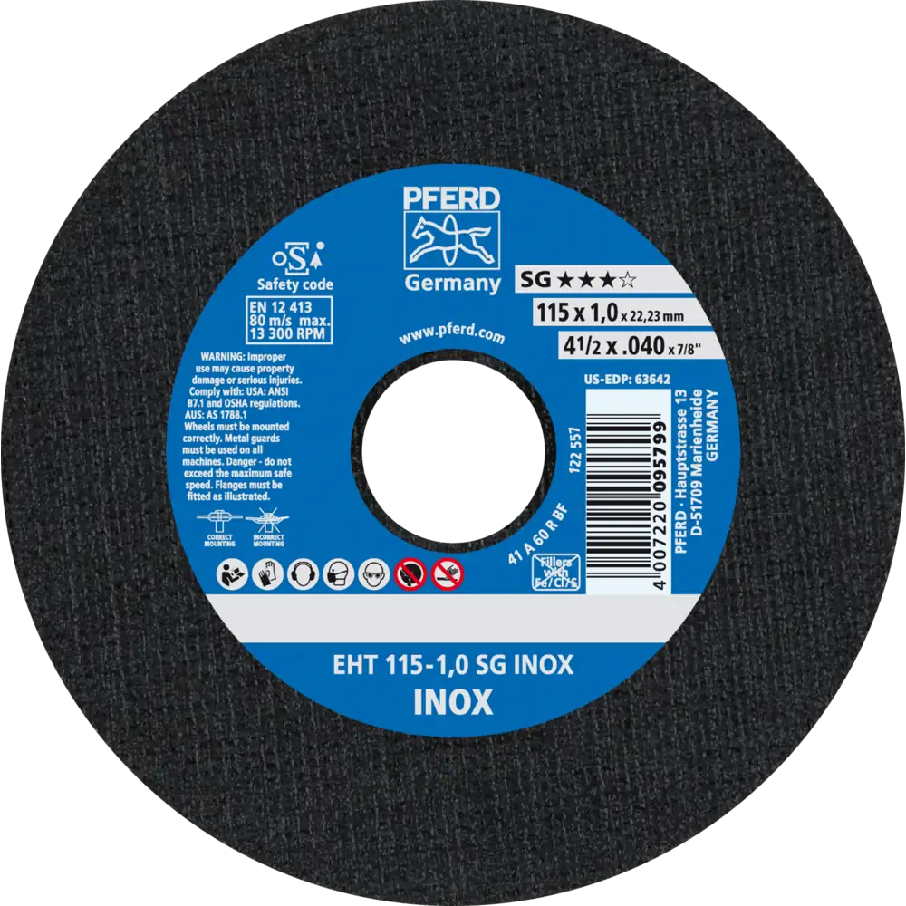 Das breite Programm der Leistungs-Linie SG bietet für jede Anwendung und jeden Werkstoff eine leistungsstarke Werkzeuglösung. Werkzeuge der Leistungs-Linie SG erzielen beste Arbeitsergebnisse bei höchster Wirtschaftlichkeit. Trennscheibe für Edelstahl (INOX) mit hoher Trennleistung und höchster Standzeit. Werker in aller Welt vertrauen Blau und wählen die dünnen Trennscheiben von PFERD TOOLS. Das PFERD TOOLS Programm bietet dünne Trennscheiben in vielen verschiedenen Ausführungen und somit für jede Anwendung die passende Werkzeuglösung – ergonomisch optimiert, effizient und auf höchstem Sicherheitsniveau. Die dünnen Trennscheiben von PFERD TOOLS zeichnen sich durch ihre besondere Bindungsrezeptur aus. Die intensive Forschungs- und Entwicklungsarbeit und die gezielte Umsetzung in den hochmodernen Fertigungsstätten garantieren die hohen Qualitäts- und Sicherheitsstandards von PFERD TOOLS.