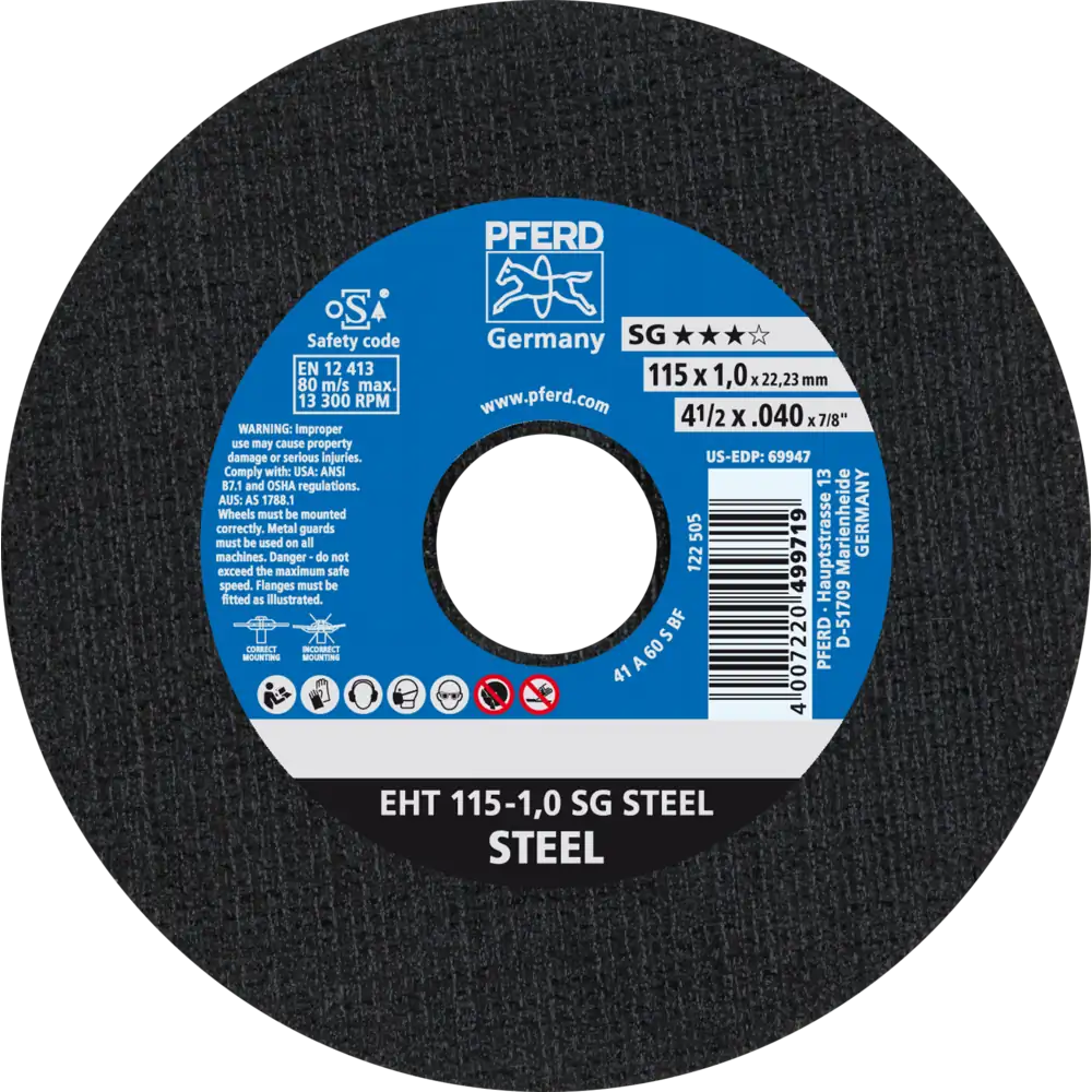 Das breite Programm der Leistungs-Linie SG bietet für jede Anwendung und jeden Werkstoff eine leistungsstarke Werkzeuglösung. Werkzeuge der Leistungs-Linie SG erzielen beste Arbeitsergebnisse bei höchster Wirtschaftlichkeit. Trennscheibe für Stahl mit hoher Trennleistung und höchster Standzeit. Werker in aller Welt vertrauen Blau und wählen die dünnen Trennscheiben von PFERD TOOLS. Das PFERD TOOLS Programm bietet dünne Trennscheiben in vielen verschiedenen Ausführungen und somit für jede Anwendung die passende Werkzeuglösung – ergonomisch optimiert, effizient und auf höchstem Sicherheitsniveau. Die dünnen Trennscheiben von PFERD TOOLS zeichnen sich durch ihre besondere Bindungsrezeptur aus. Die intensive Forschungs- und Entwicklungsarbeit und die gezielte Umsetzung in den hochmodernen Fertigungsstätten garantieren die hohen Qualitäts- und Sicherheitsstandards von PFERD TOOLS.