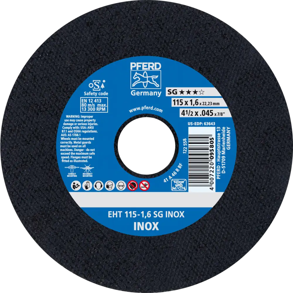 Das breite Programm der Leistungs-Linie SG bietet für jede Anwendung und jeden Werkstoff eine leistungsstarke Werkzeuglösung. Werkzeuge der Leistungs-Linie SG erzielen beste Arbeitsergebnisse bei höchster Wirtschaftlichkeit. Trennscheibe für Edelstahl (INOX) mit hoher Trennleistung und höchster Standzeit. Werker in aller Welt vertrauen Blau und wählen die dünnen Trennscheiben von PFERD TOOLS. Das PFERD TOOLS Programm bietet dünne Trennscheiben in vielen verschiedenen Ausführungen und somit für jede Anwendung die passende Werkzeuglösung – ergonomisch optimiert, effizient und auf höchstem Sicherheitsniveau. Die dünnen Trennscheiben von PFERD TOOLS zeichnen sich durch ihre besondere Bindungsrezeptur aus. Die intensive Forschungs- und Entwicklungsarbeit und die gezielte Umsetzung in den hochmodernen Fertigungsstätten garantieren die hohen Qualitäts- und Sicherheitsstandards von PFERD TOOLS.