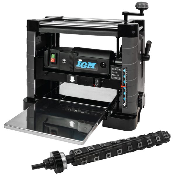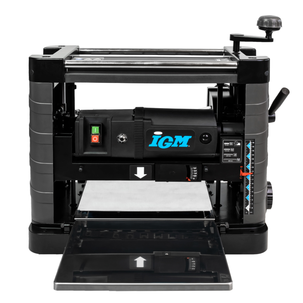 Die erste Desktop-Spiral-Dickenhobelmaschine mit einem Spiralzylinder mit Hartmetallmessern auf dem europäischen Markt. Präzise bearbeiteter Spiralhobelkopf mit 36 ​​in 4 Spiralen gelagerten Hartmetallmessern für maximale Sauberkeit und Bearbeitungseffizienz. Der Spiralkopf hobelt mühelos und sehr sauber auch sehr harte und exotische Hölzer, das Holz quer, spaltet keine Äste und die gehobelte Oberfläche ist unter allen Bedingungen viel glatter als nach der Arbeit mit gewöhnlichen Messern. Hartmetall-Messer sind im Vergleich zu klassischen HSS-Hobelmessern um ein Vielfaches haltbarer und können für eine noch längere Lebensdauer 4-fach gedreht werden, ohne dass ein Austausch oder langes Warten auf das Schärfen und das Einrichten in eine Trommel nötig ist. Dank des integrierten Ventilators und Staubbeutels kann die Maschine auch ohne Sägemehlabsaugung verwendet werden, um Sägemehl effizient aus dem Zylinder zu entfernen. Selbstverständlich kann hier auch ein Industriestaubsauger oder eine Absauganlage angeschlossen werden. Für maximale Dickengenauigkeit ist die Streckhöhe arretierbar. Für maximale Arbeitssicherheit ist die Maschine mit gummierten Vorschubrollen ausgestattet, die das Werkstück fest halten und bewegen, und Stahlhaken vor der Rolle verhindern einen Rückschlag. Der leistungsstarke Motor ist mit einem Überlastschutz und einem Wiederanlaufschutz bei Stromausfall ausgestattet.
